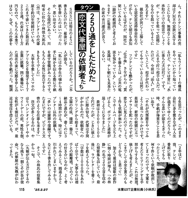 週刊新潮に代筆屋デンシンワークス代表・小林慎太郎が取り上げられました。